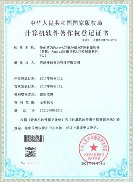 FancyAGV磁導(dǎo)航AGV控制器軟件著作權(quán)登記證書